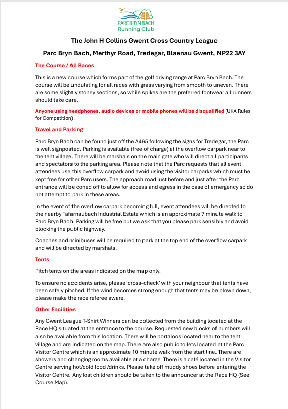 Saturday 28th February is the 5th and final round in the John Collins Cross Country League at Parc Bryn Bach, Merthyr Road, Tredegar, Blaenau Gwent, NP22 3AY. With all junior, senior and masters teams very competitive in their respective league tables, we will be looking for another big turnout for the club round 5 please.