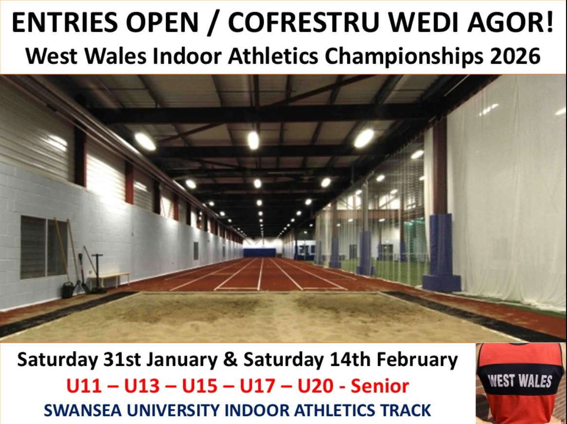 The 2026 West Wales Indoor Athletics Championships will take place at Swansea over two days, Saturday 31st January and Saturday 14th February. This is a closed championship for West Wales eligible athletes only (held under UKA rules). All jumps events (Long Jump, Triple Jump, High Jump and Pole Vault) will take place on Day 1 with Shot Put, 60m and 60m Hurdles on the second Saturday. The championship are open to all age groups – from the under 11’s to seniors and is for all athletes of all abilities.